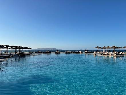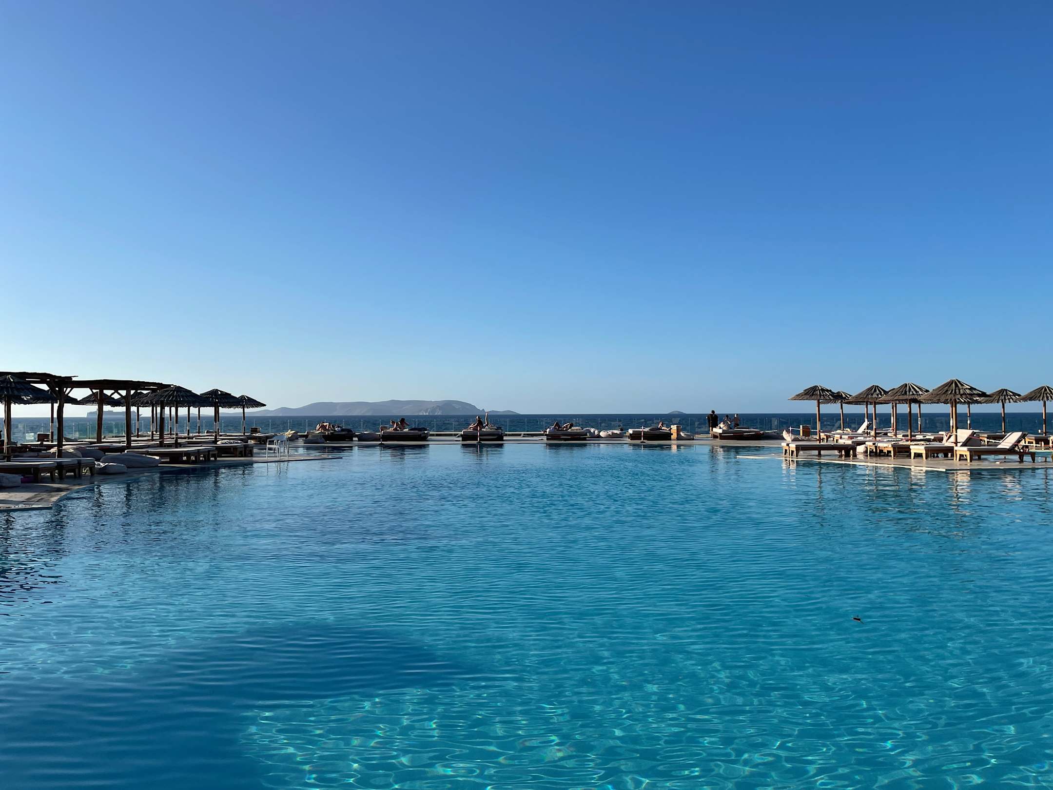 PoolHauptpool, nach 18 Uhr, daher leer. Auch hier sind die Schirme leider zu klein, um Schatten zu erzeugen.
