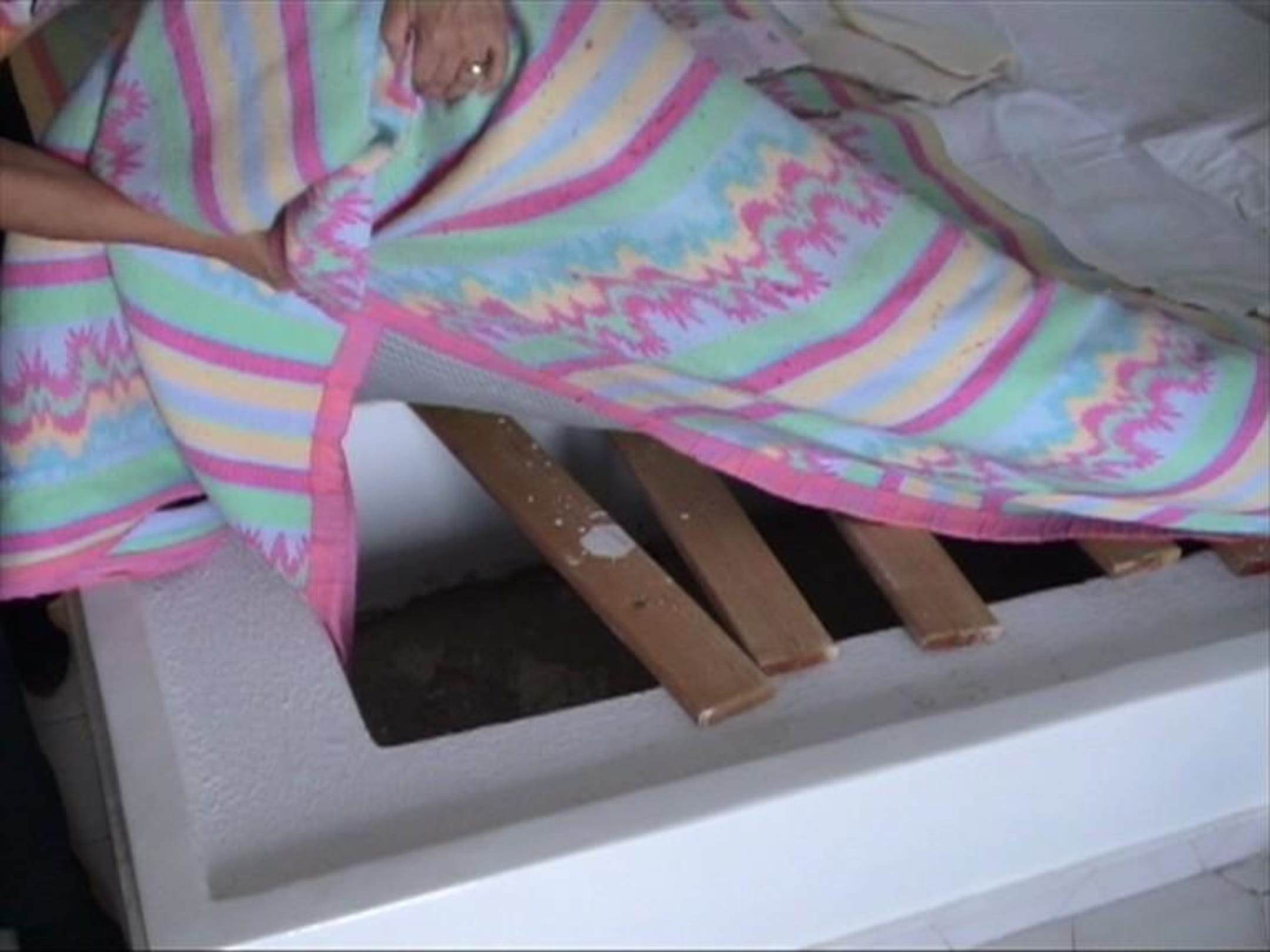 Bettenrost des gemauerten Bettes im Mitsis Hotel Rinela Beach Crete. Lose unbehandelte mit Farbe verschmierte Holzlatten bilden die Unterlage der Matratze. 4 Sterne Komfort auf griechisch????