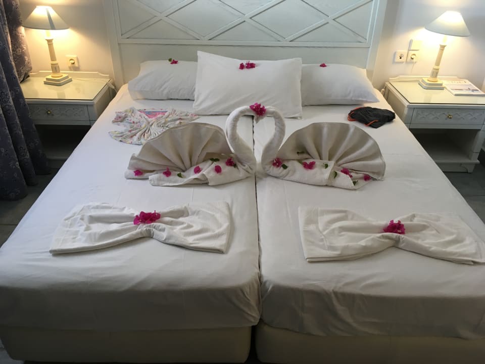 Handtuch-Schwäne auf unserem Bett .Liebevoll gefaltet von einer der Putzfeen.