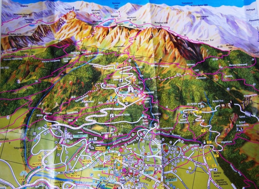 Wandermöglichkeiten in direkter NäheDie Panoramakarte zeigt die Wandermöglichkeiten in direkter Nähe des Mitterplarser Hofs (Nr. 205 / rot). Der Algunder Waalweg, Schlundensteinweg, Ochsentodweg (nicht SO dramatisch und kurz), Tappeiner Weg und oben der Meraner Höhenweg waren 'unsere Strecken'.