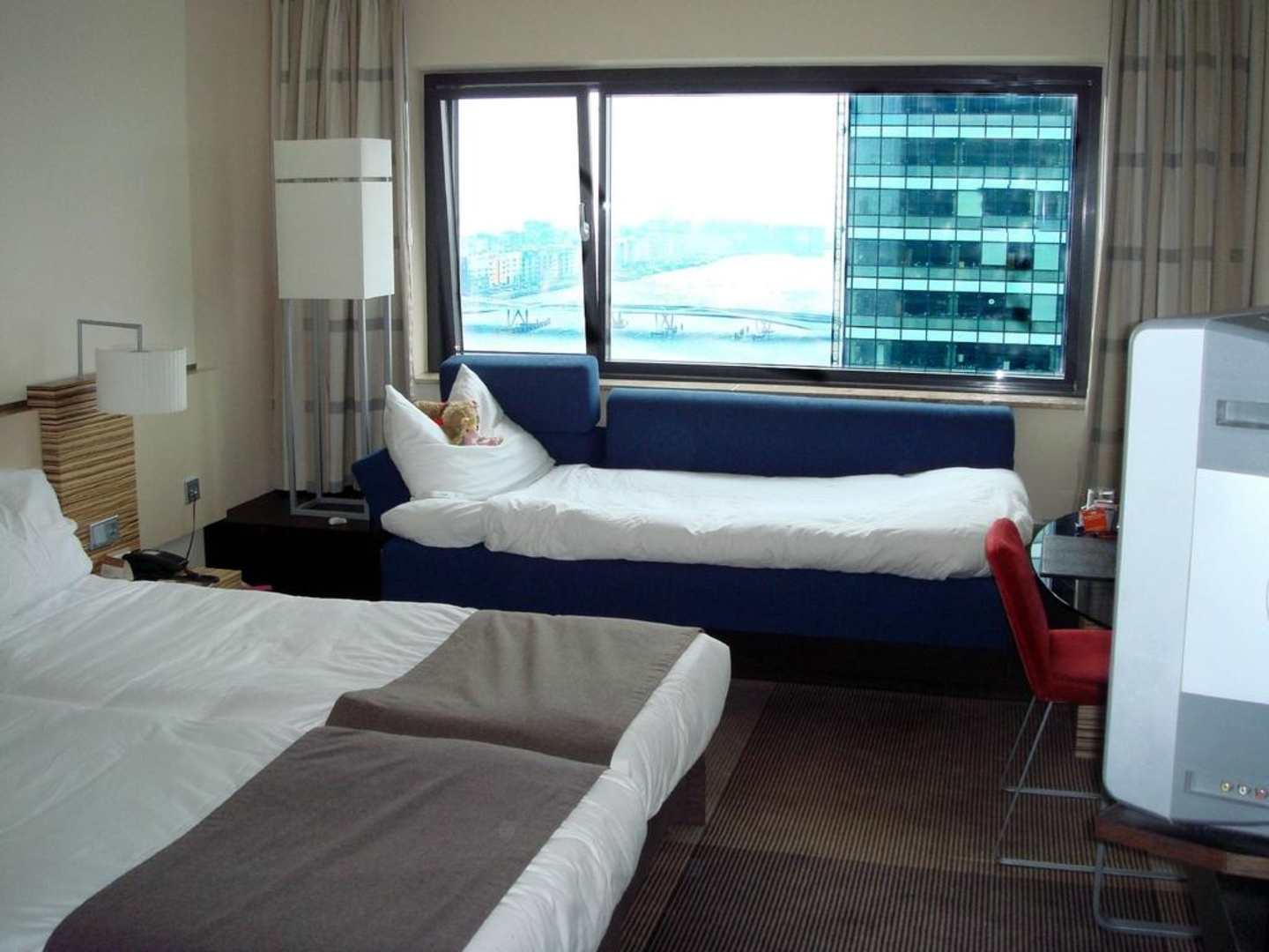 Doppelzimmer mit Aufbettung im 14. OGDer Blick aus dem Zimmerfester geht direkt auf das Passenger Terminal Amsterdam.