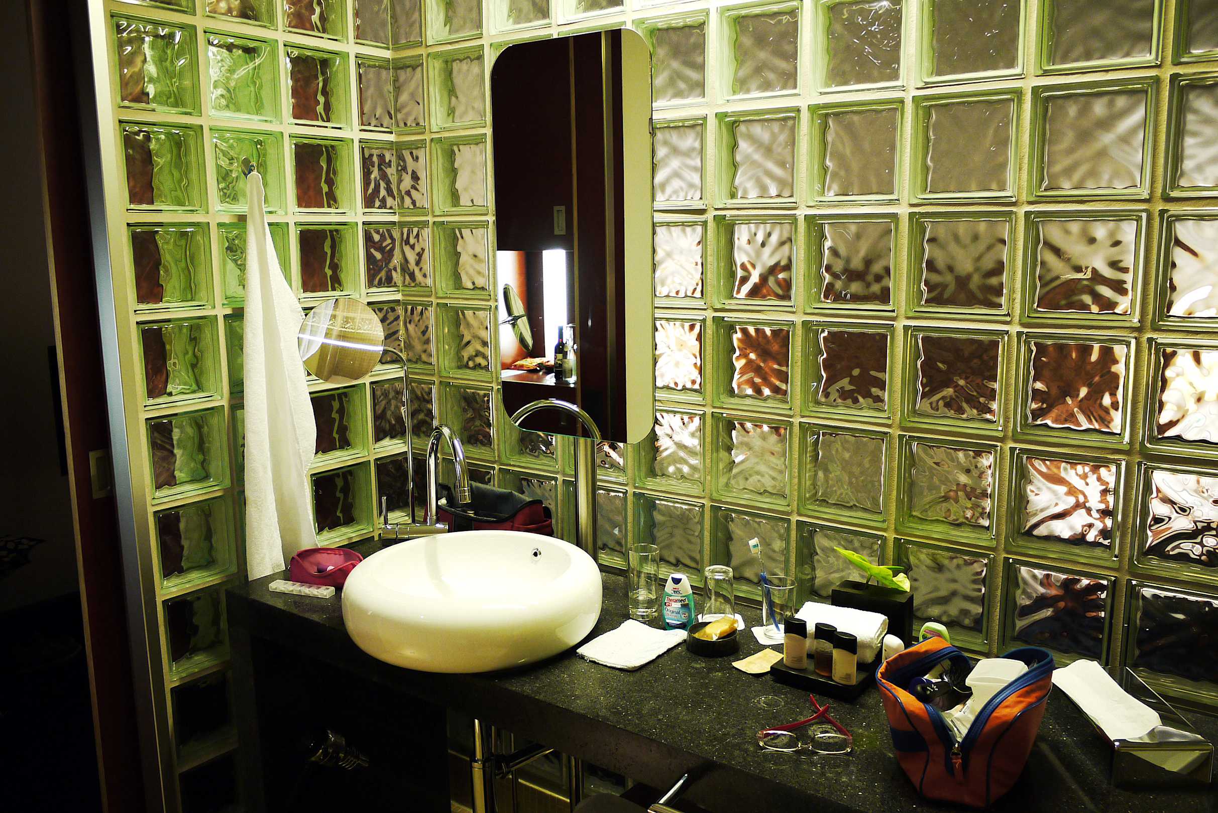 Stilvolle Abtrennung des Bads mit Glasziegeln