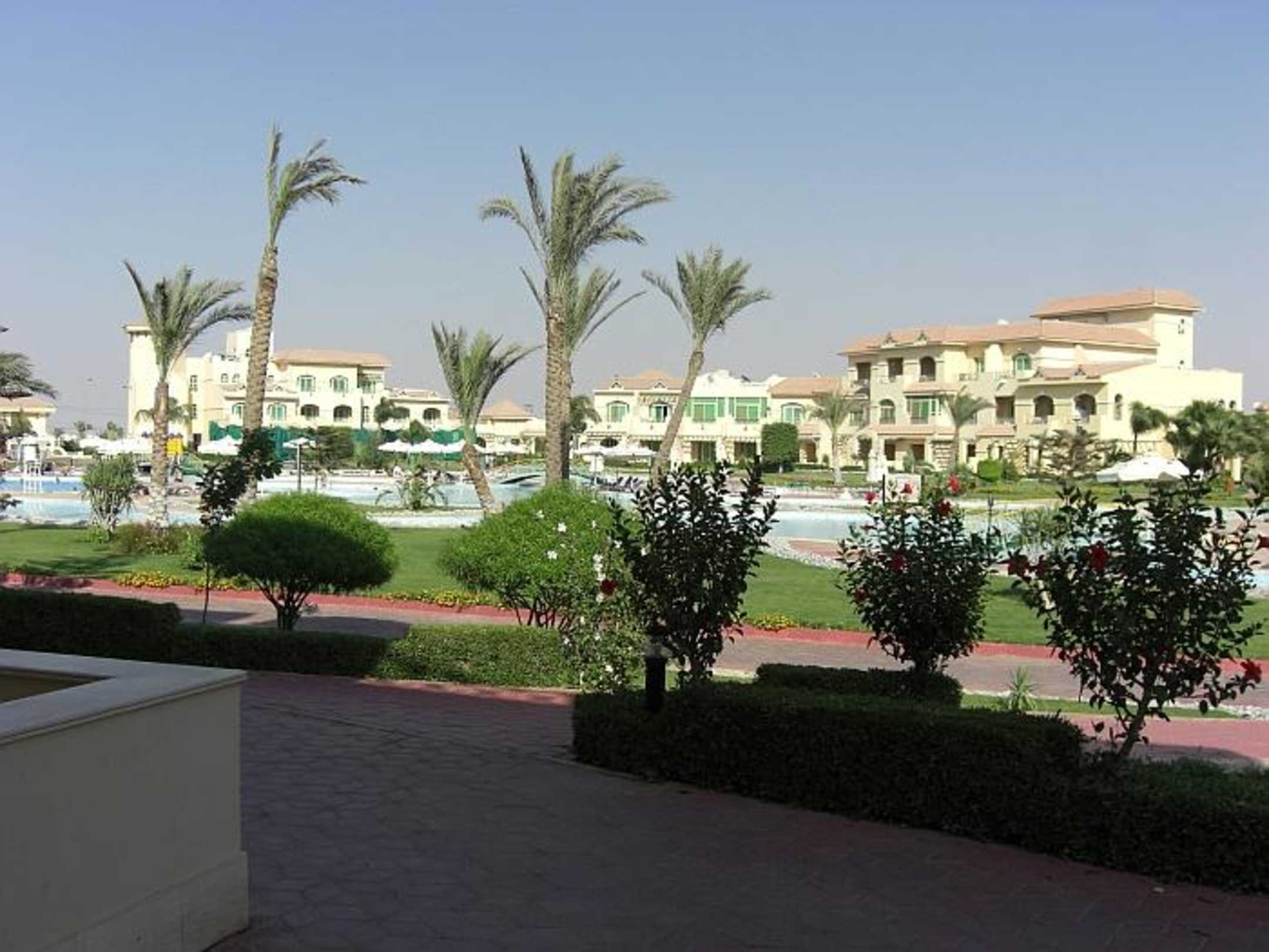 Blick auf das HauptgebäudeBlick quer über das Gartenanlage mit der weitläufigen Pool-Anlage auf das Zentralgebäude der Anlage.