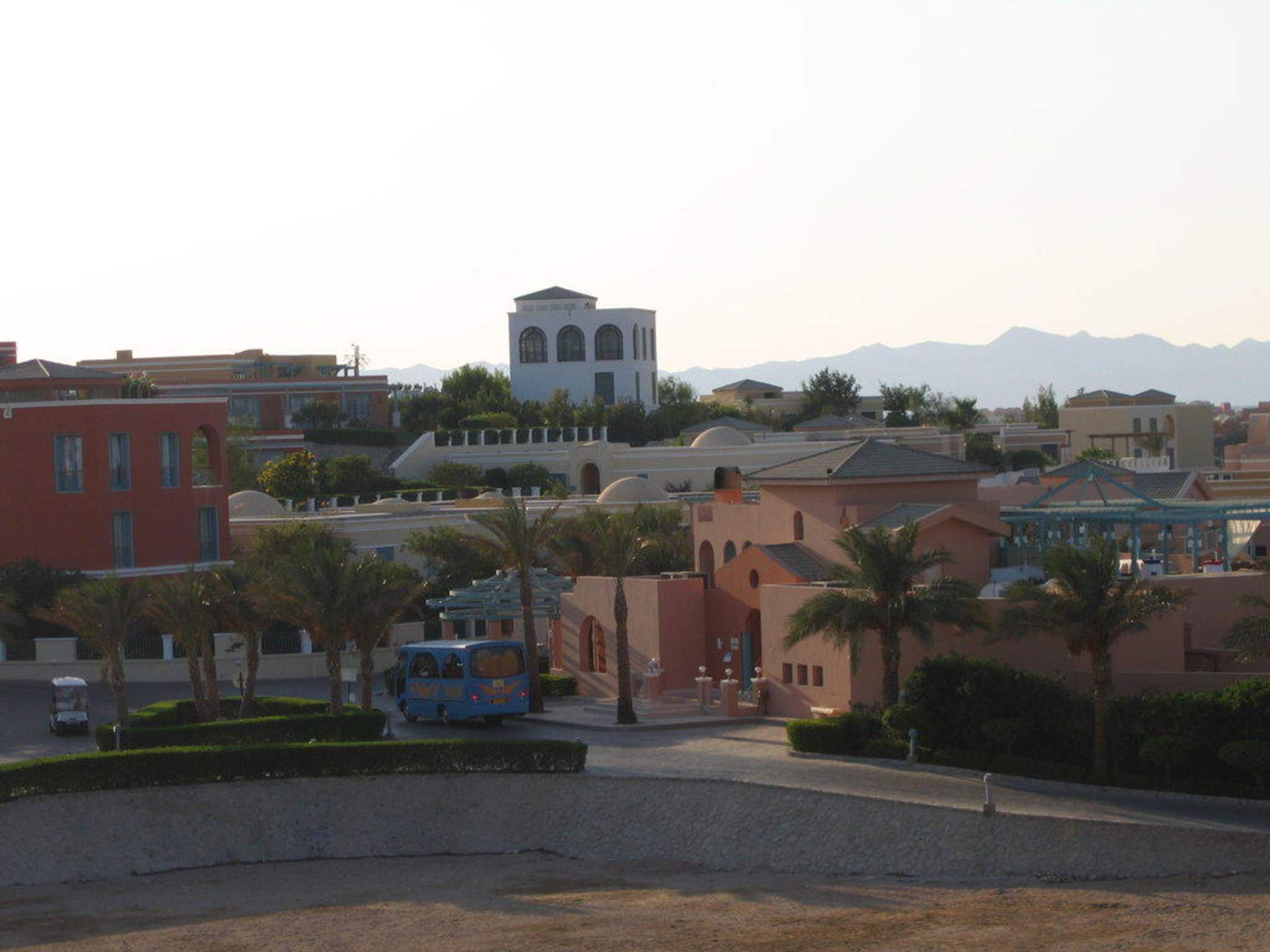 Haupteingang Restaurant Il LimoneIm Hintergrund der 8000-er Zimmerbereich und ein Teil der privaten Hill Villas. Vor dem Restaurant steht der Shuttle-Bus, der regelmäßig nach El Gouna fährt