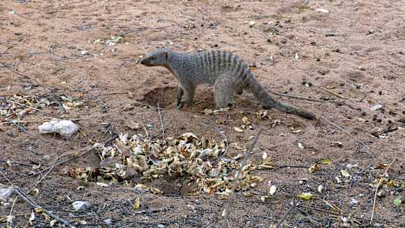 im Garten freilaufende Zebramanguste