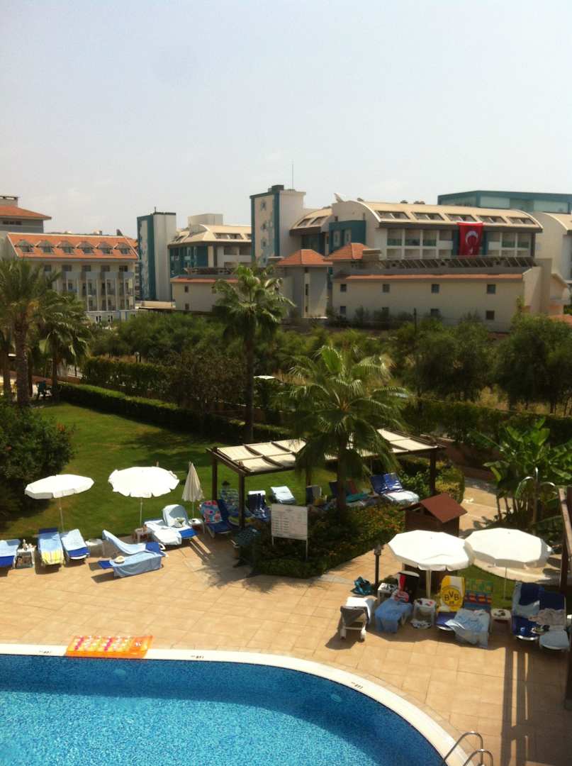 Blick vom Hotel auf Pool und Poolbar