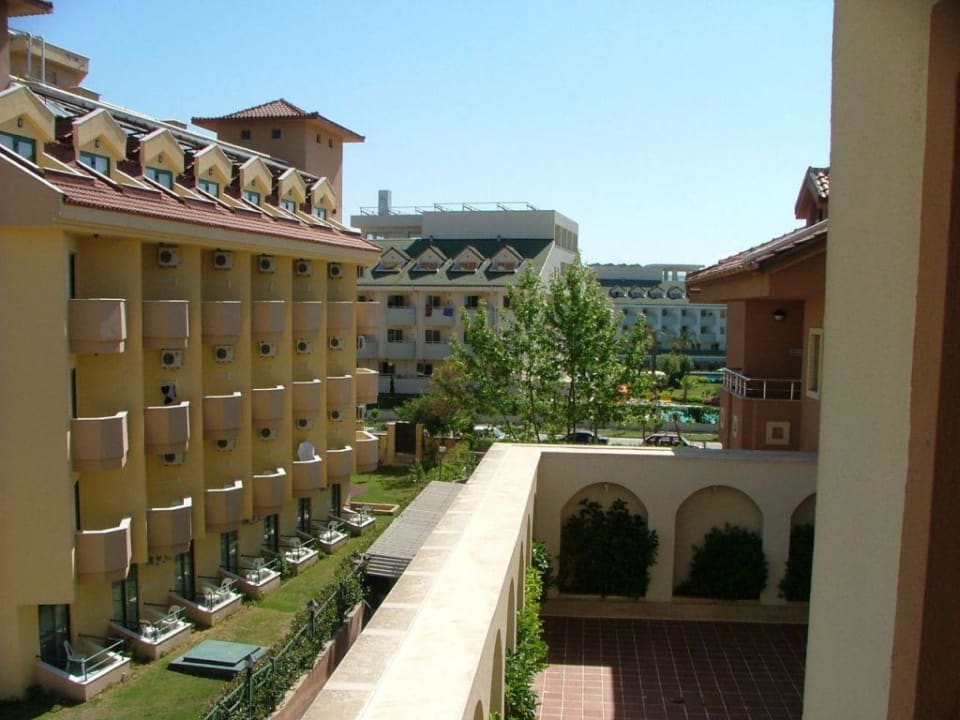 Links das Nachbarhotel und gerade aus das Schwester-Hotel Monachus Park.