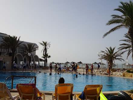 großer Pool, komplett ohne Sonnenschirme ( die im Hintergrund sind am Strand)