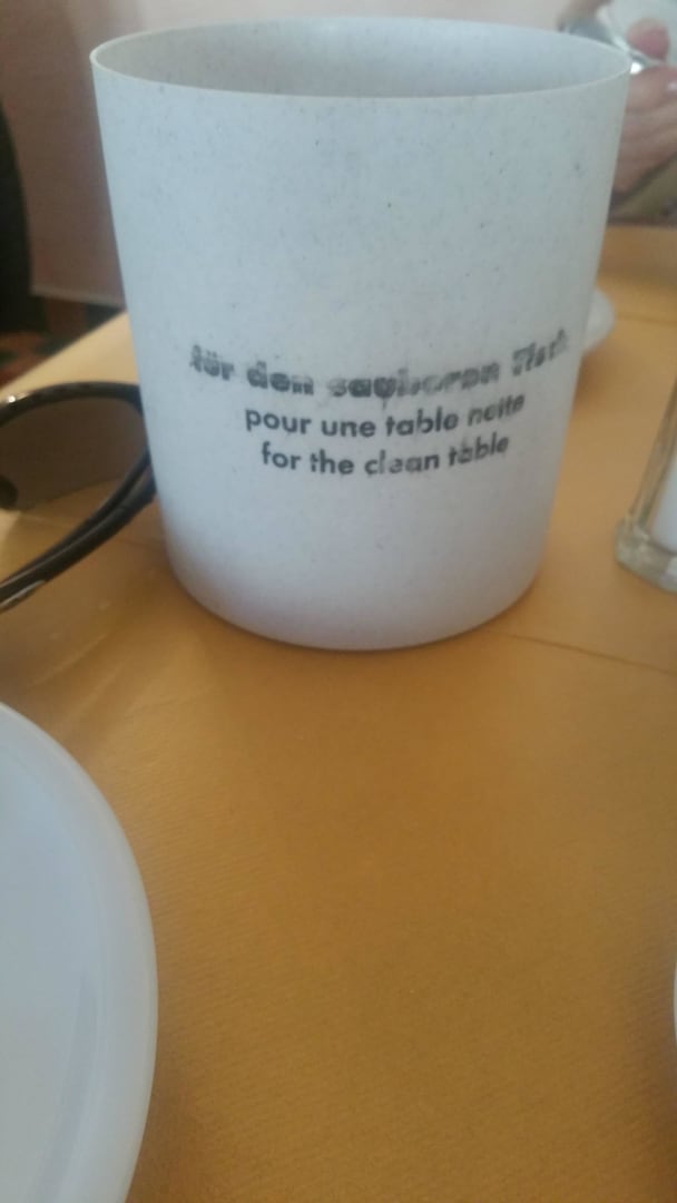 Kann man das lesen? Egal.Unwichtig. Ist ja nur ein Abfalleimer auf dem Tisch.