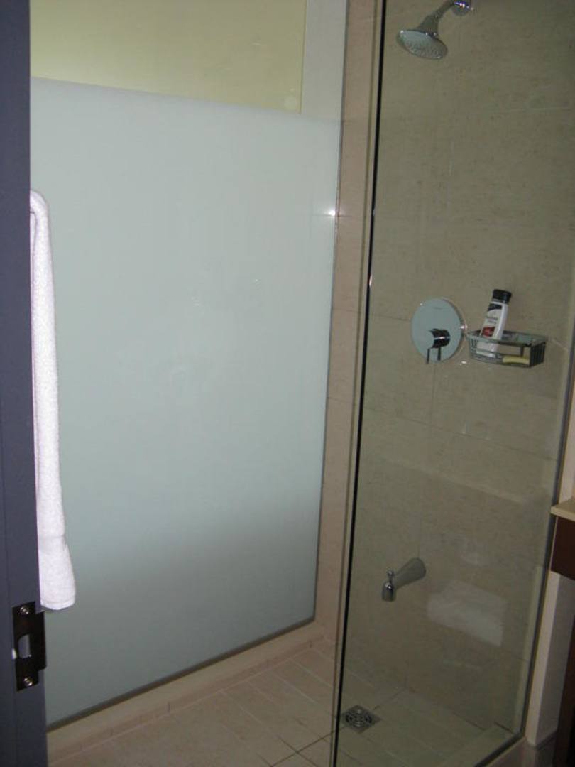 Duschbereich, Zimmer 624Die Dusche hatte eine indirekte Beleuchtung und war durch die Glasscheibe mit Sichtschutz vom Zimmer getrennt.