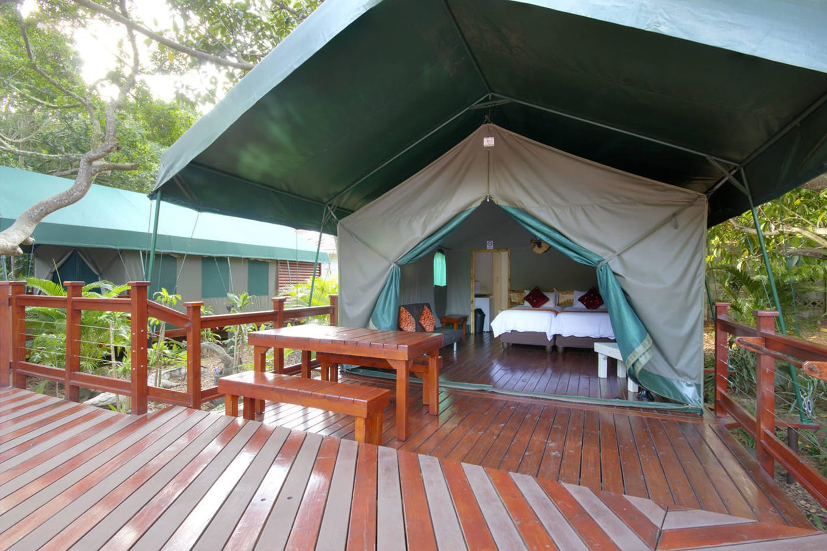 Picnic table on deck for every tent