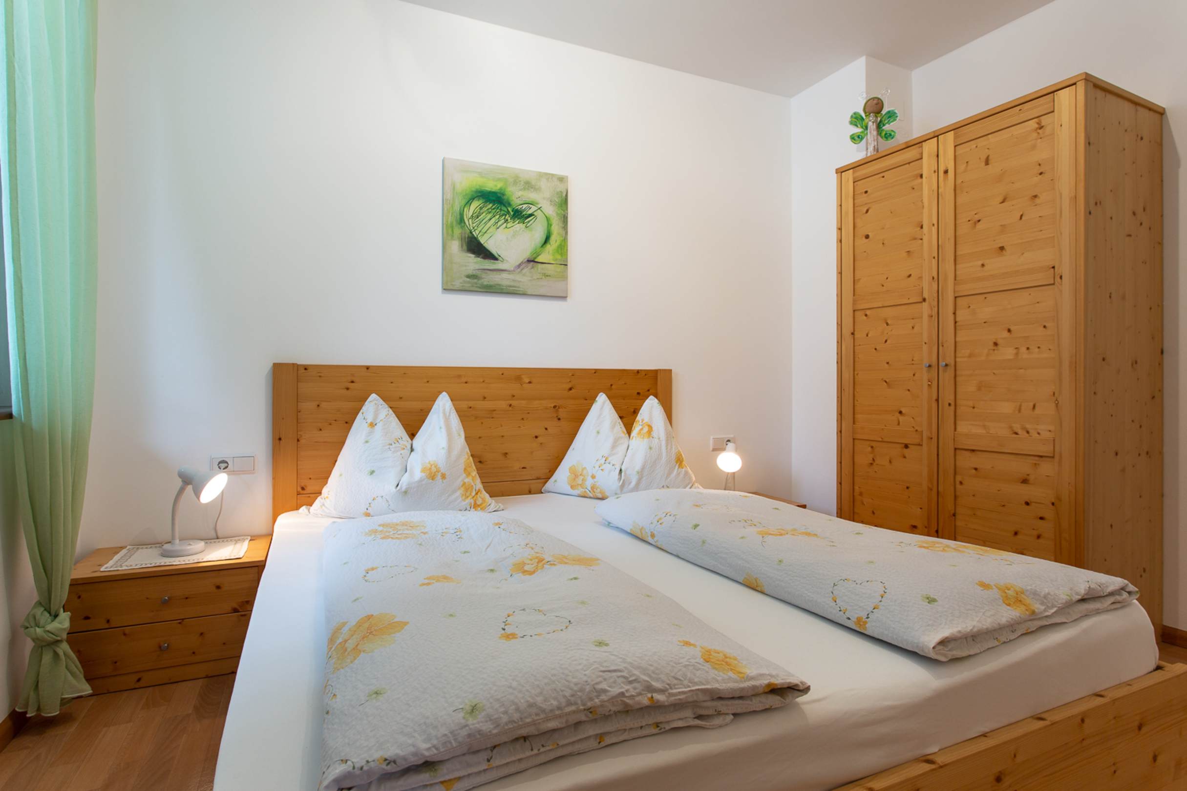 Ein komfortables Schlafzimmer mit Ausblick auf die grüne Natur