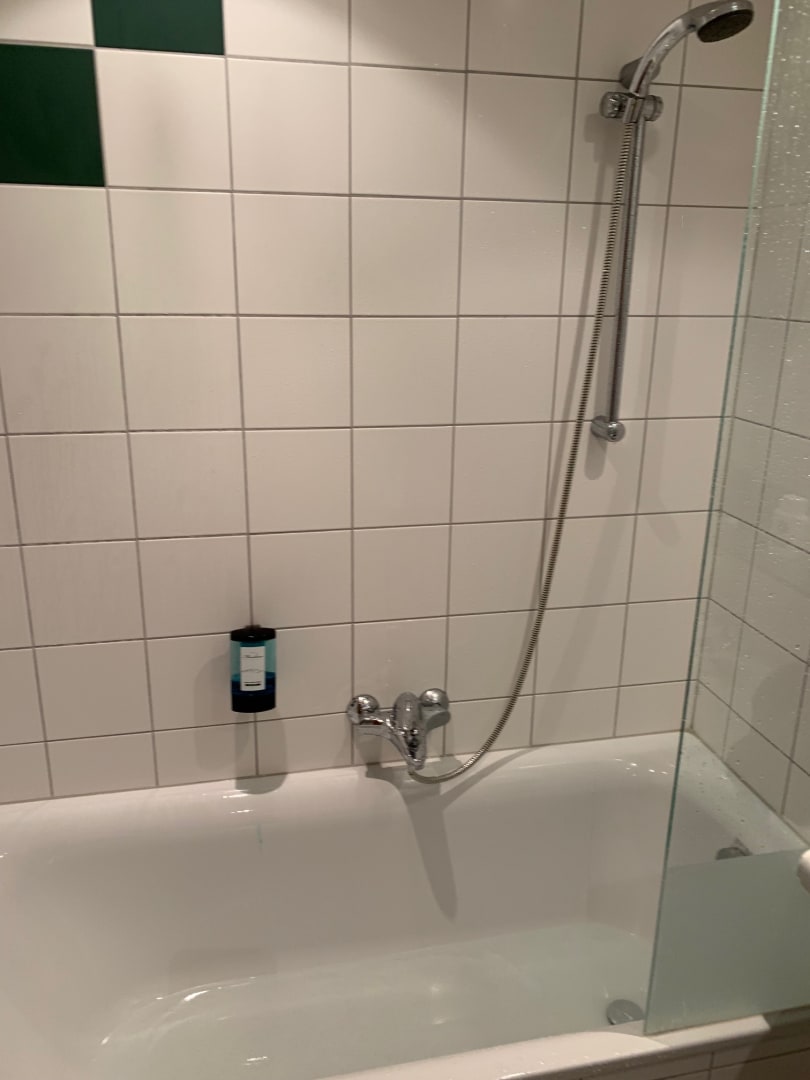ZimmerDusche in der Badewanne, nur für Personen bis max. 1,65 m geeignet, ca. 25 cm von Wand entfernt, normales Duschen nicht möglich