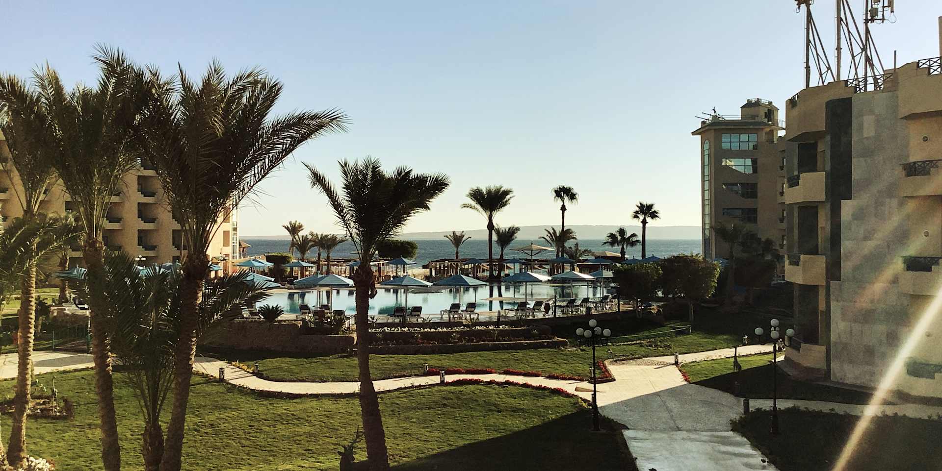 Blick von der Terrasse der Bar in Richtung Pool(s) und Meer.