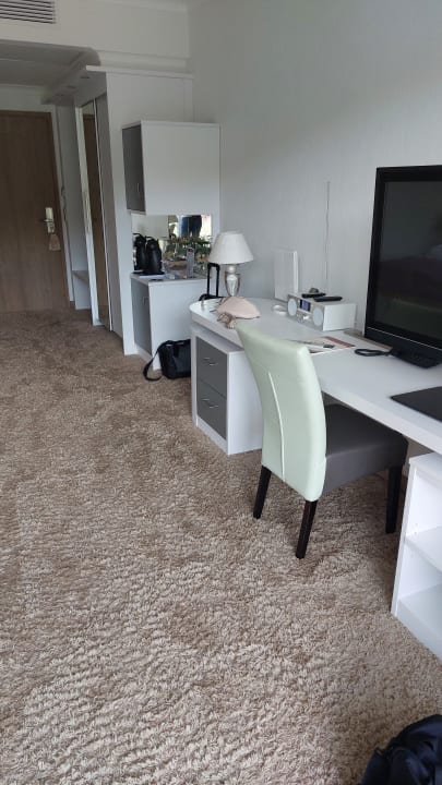 Schreibtisch mit Radio und großem TV