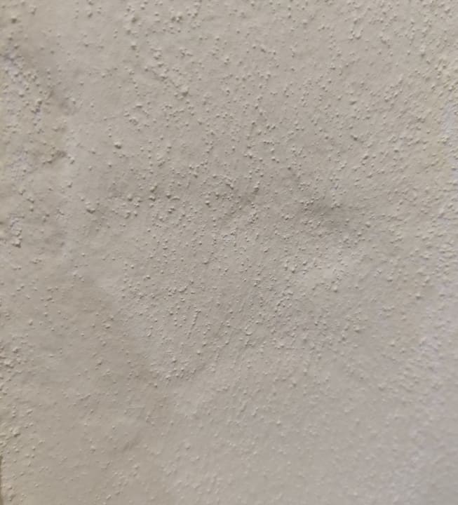 Wandbereich neben der Eingangstür mit Lochgratern in der Putzfläche.... schön ist anders.