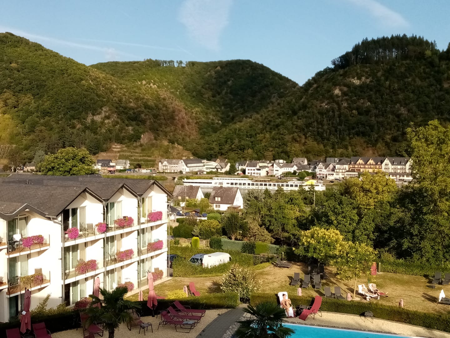 Blick vom Balkon über Pool und Mosel