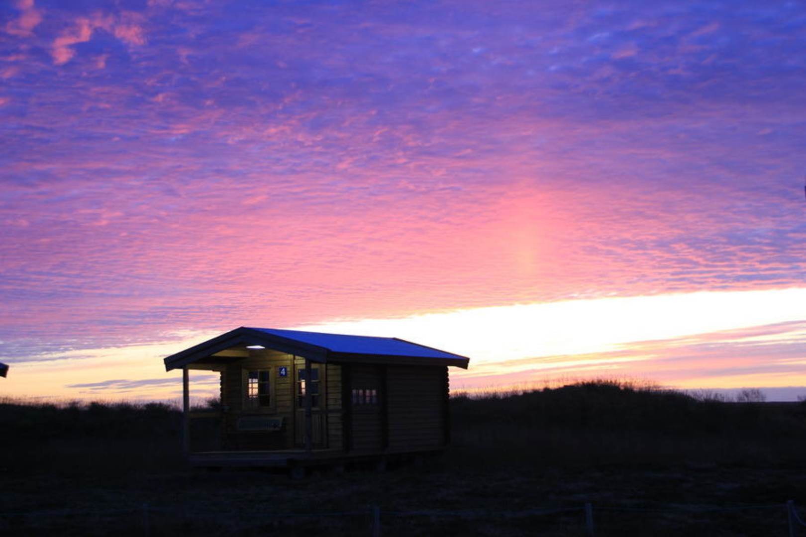Blick auf die Hütte im Abendlicht mit Nebensonne. Nebensonnen sind nicht selten aber sicher selten über der Hütte des Alex in Keflavik.