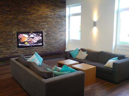 Lobby mit cooolem FlatTV in der Holzwand