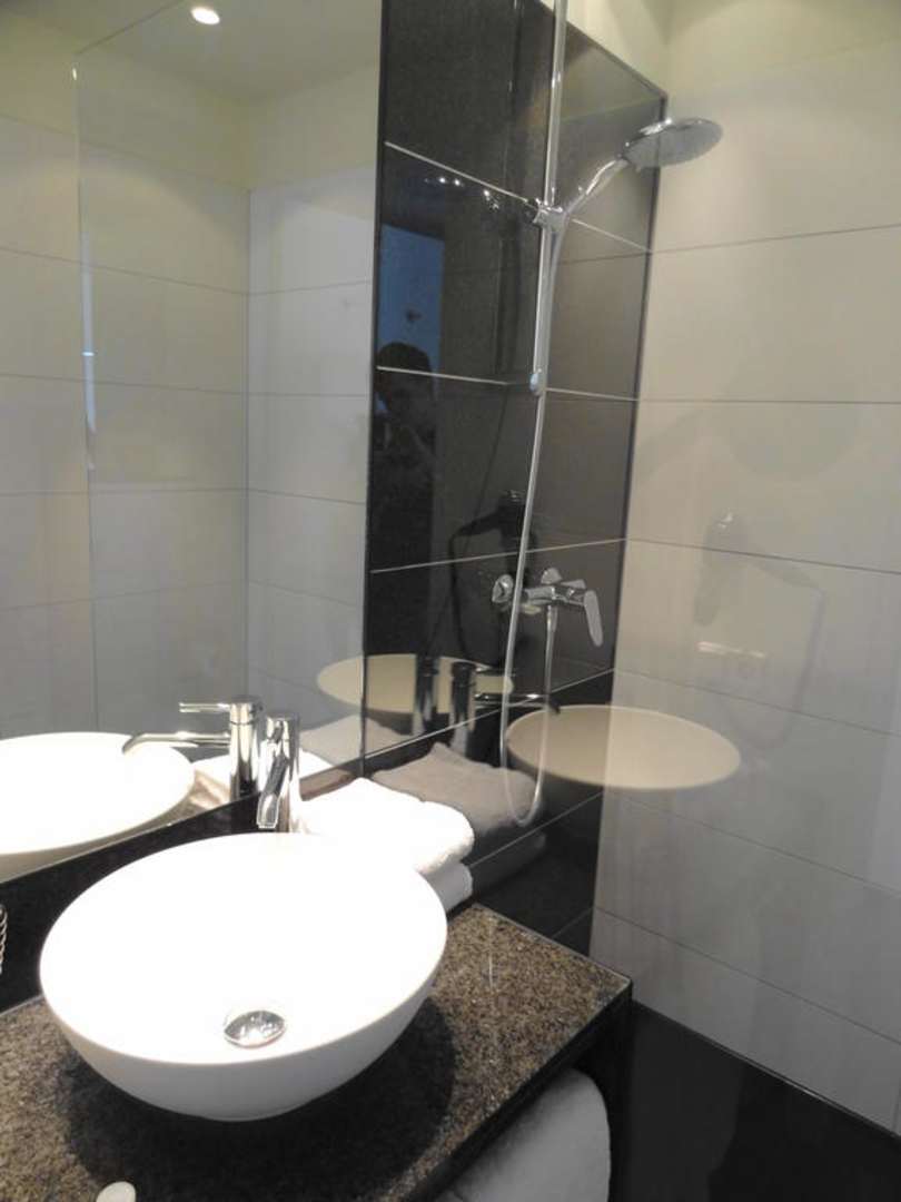Bad Gesamtansicht mit Waschbecken und Dusche