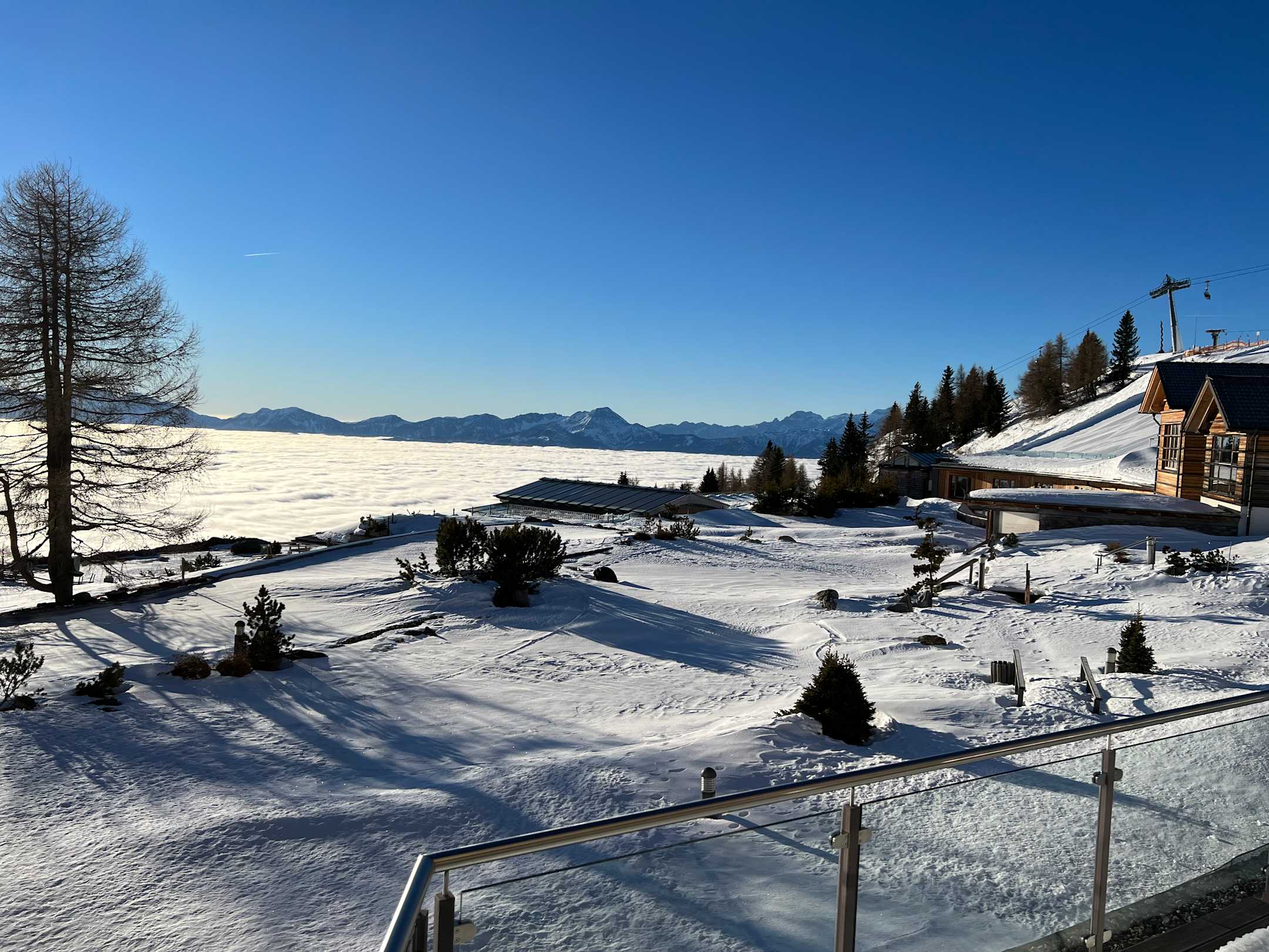 Ausblick von der Terrasse am Feuerberg mit Nebel im Tal