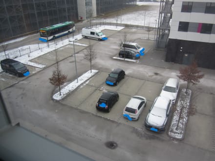 Blick aus dem Zimmerfenster auf den Moxy-Parkplatz