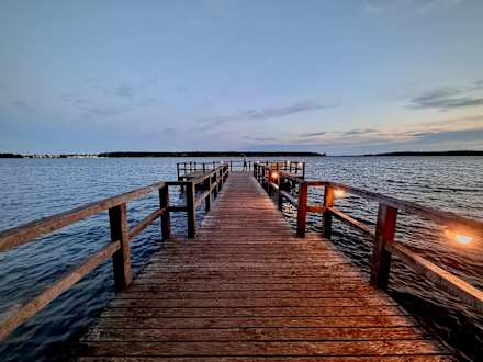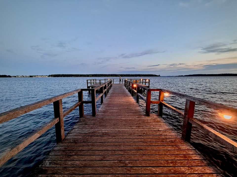 Der Badesteg gegenüber dem Hotel am Abend