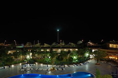 nächtlicher Blick auf den Leuchtturm und einen Teil der Hotelanlage