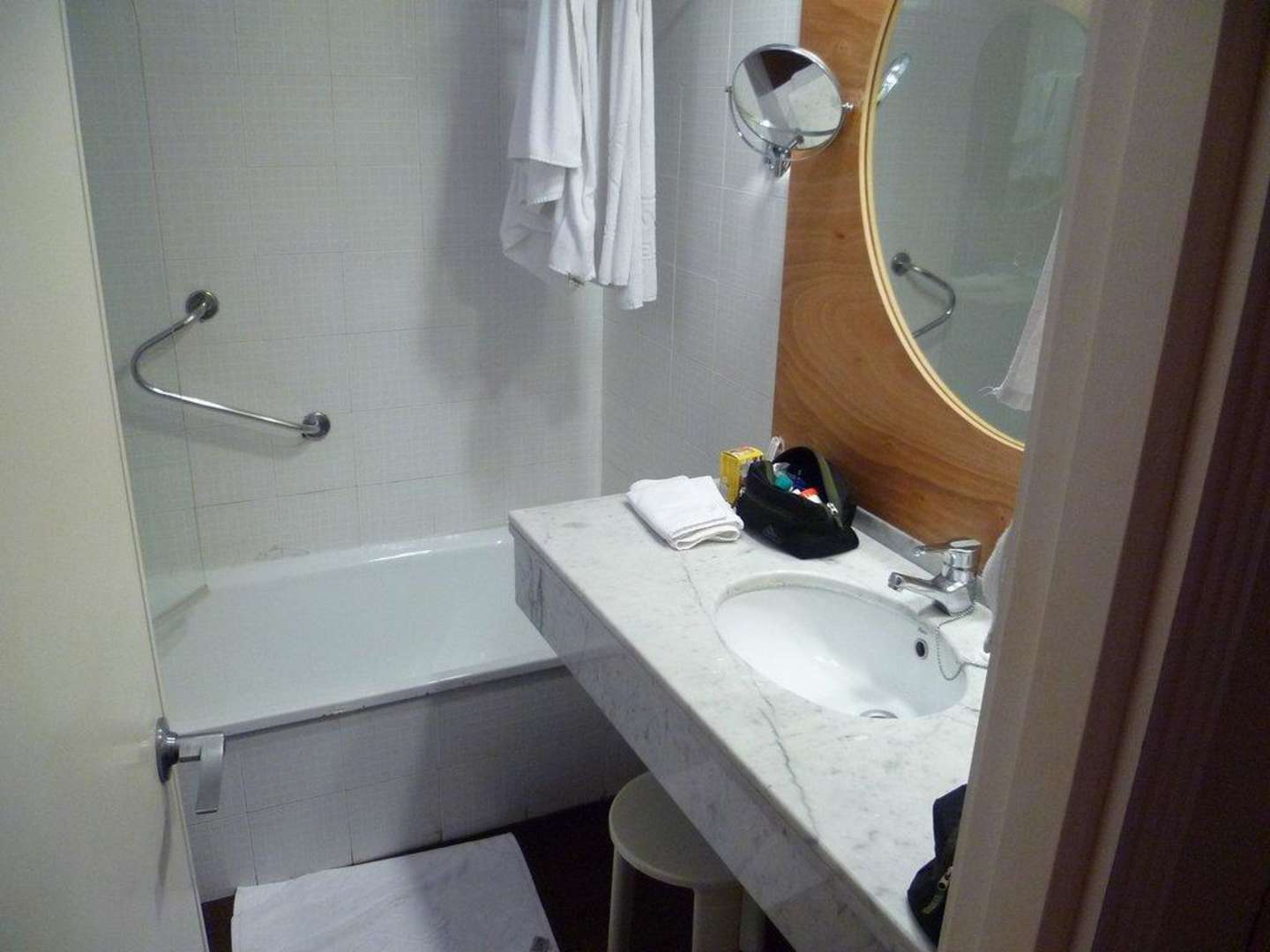 Das BadezimmerDas Bad ist in die Jahre gekommen und wurde zuletzt durch einen dunklen Holzboden und einem neuen Spiegel aufgewertet.