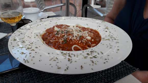 An der Außenbar. Zuviel Tomatensoße, zuwenig Hackfleisch. Portionsgröße gut.