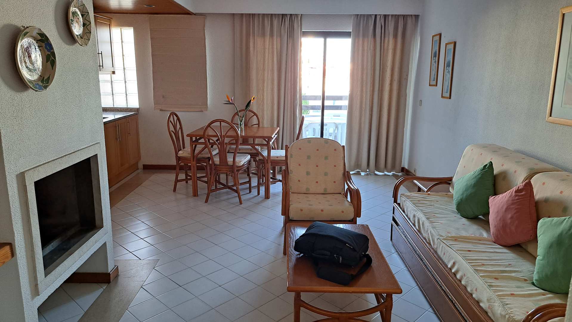 Wohnzimmer mit Küchenzeile und Kamin