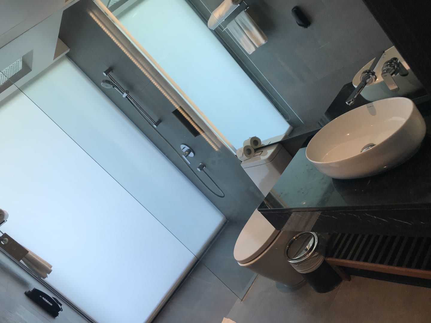 ZimmerDas Badzimmer, in der Dusche kann man den Vorhang hoch ziehen und hat damit einen wunderschönen Blick auf das Meer.