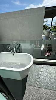 Zimmer mit Badewanne auf dem Balkon.