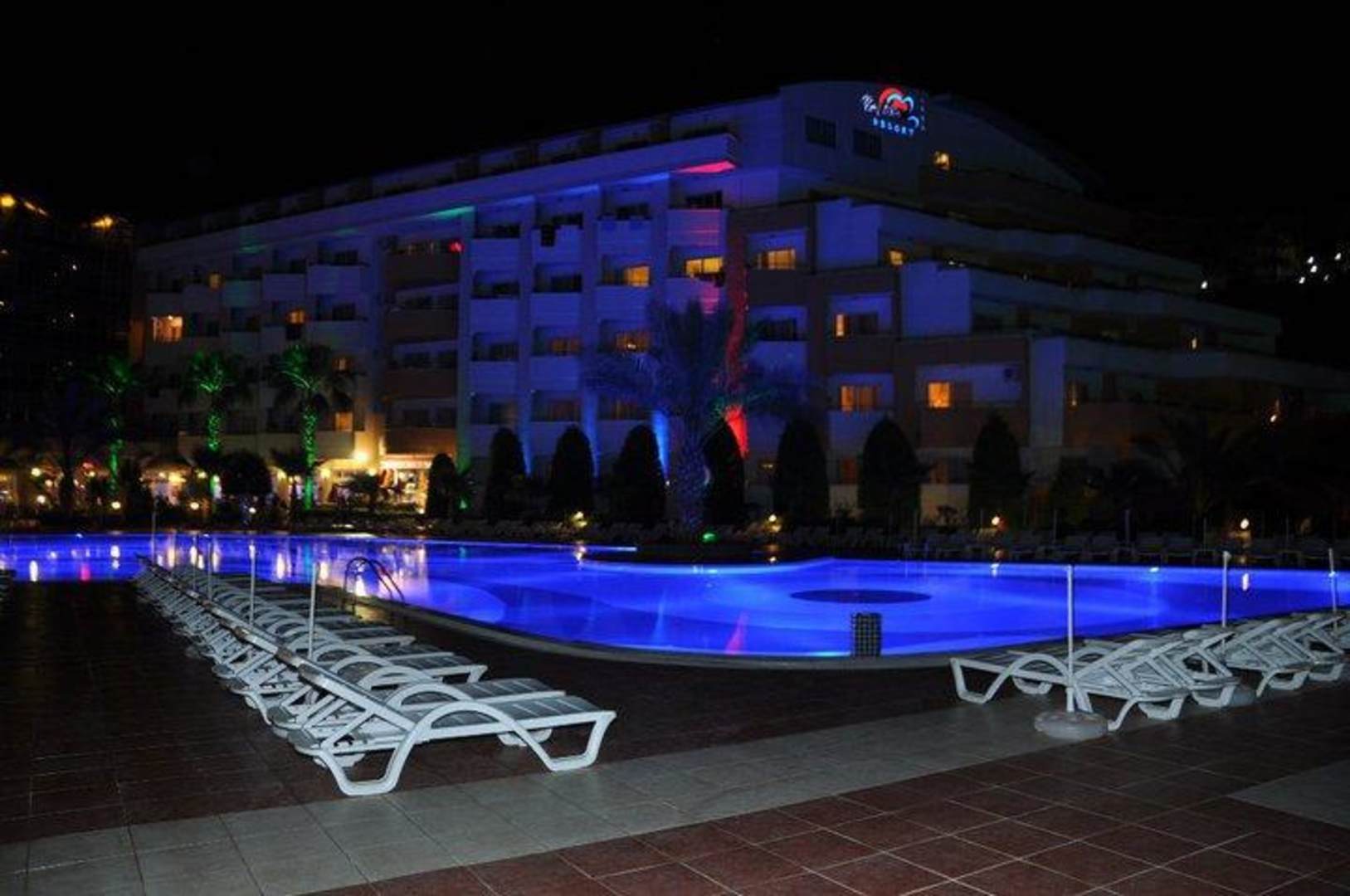 Pool & Hotel bei Nacht