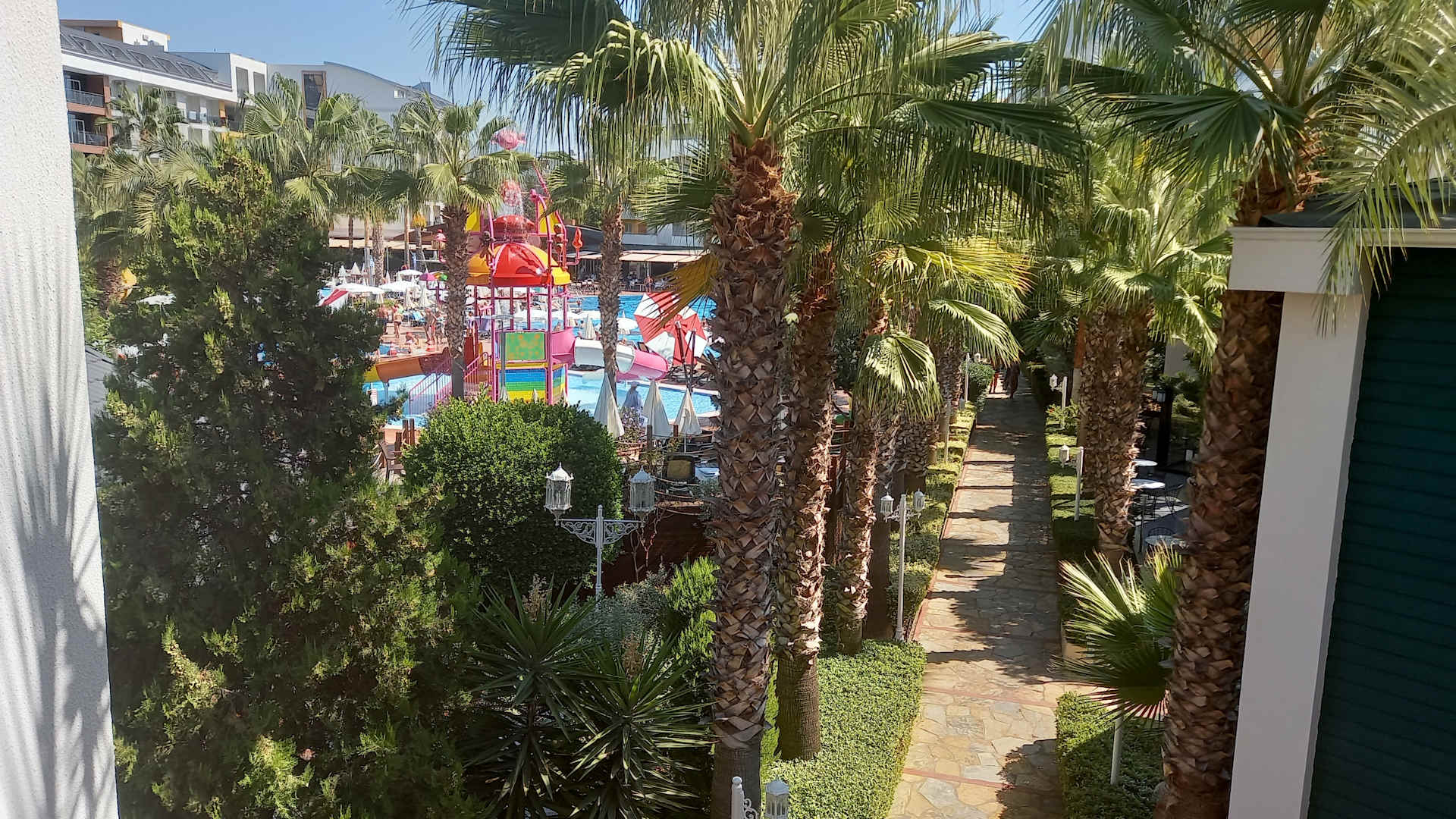 Blick vom neuen Übergang auf den tollen Poolbereich mit neuer Kinderattraktion.