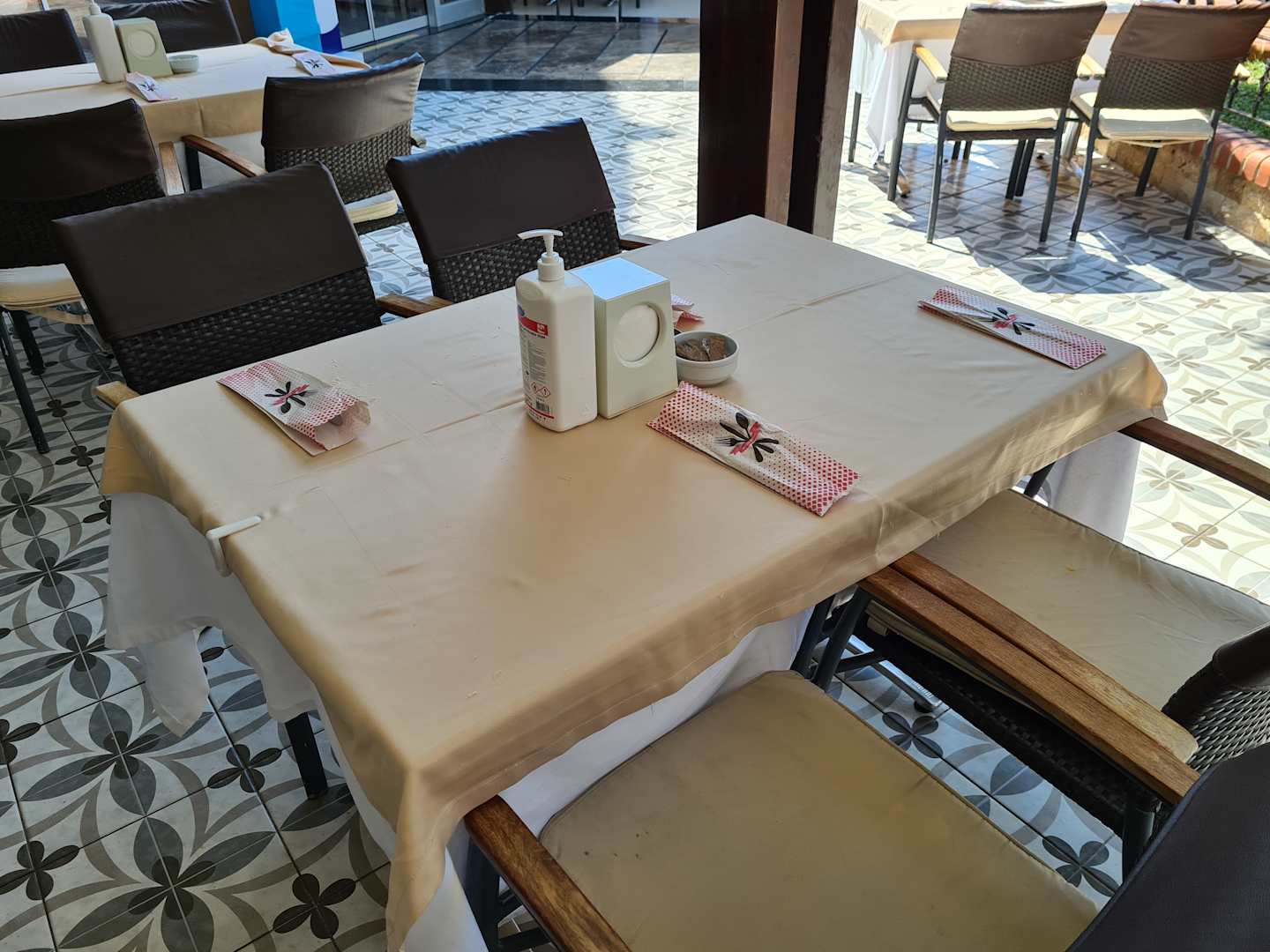 Mit Desinfektionsmittel am Tisch