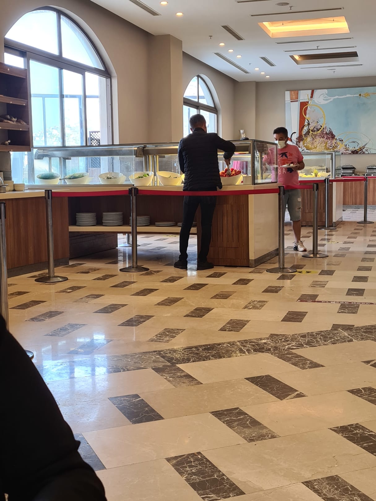 Corona Abstandsbänder vorhanden , eigentlich sollte das Servicepersonal das essen ausgeben.. aber da dieses nicht immer vor Ort ist , gibt es Selbstbedienung.