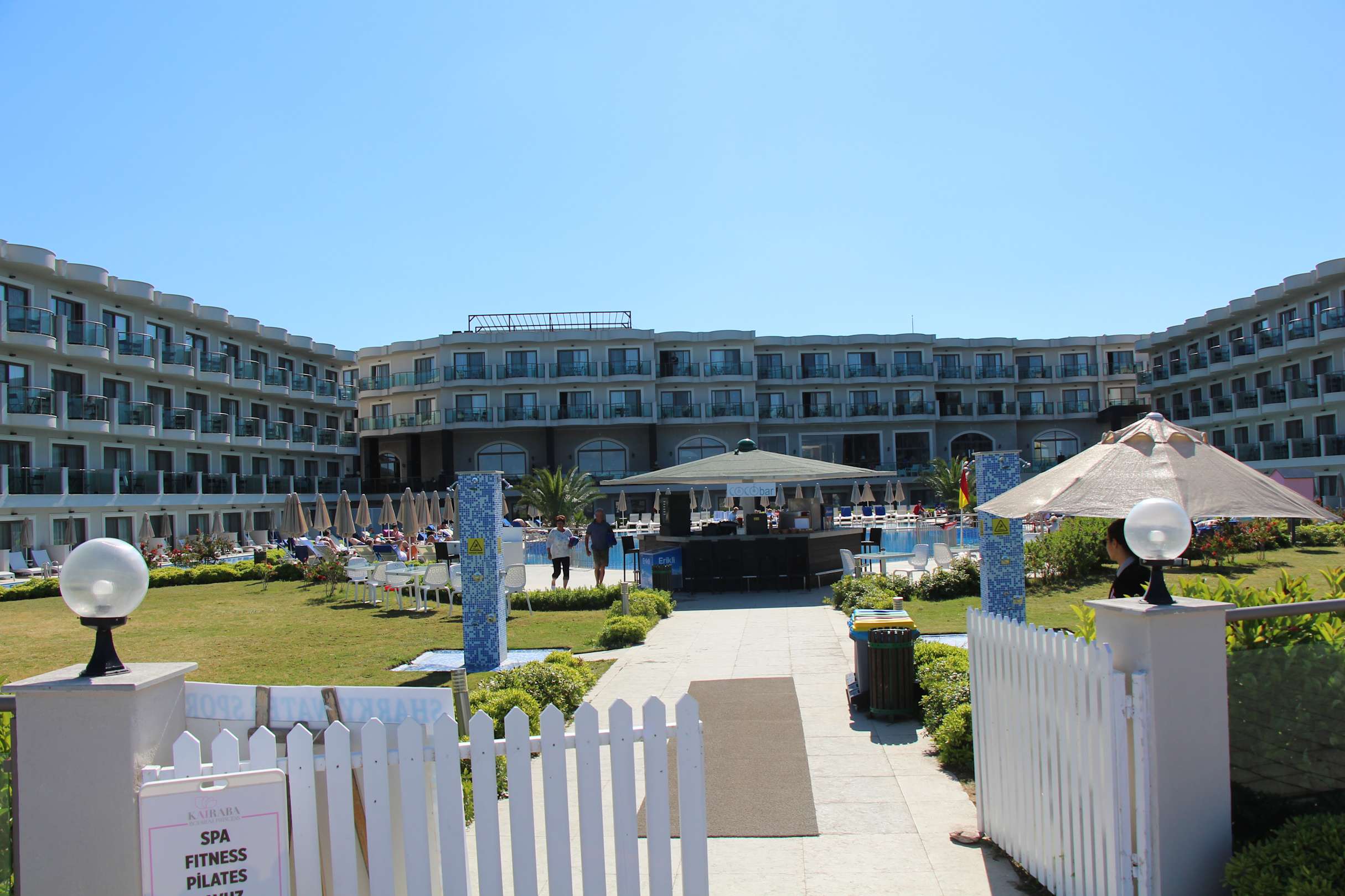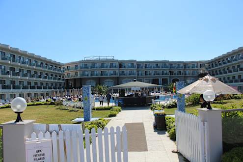 Blick von der Strandpromenade über die Poolbar und den Pool zum Hotel