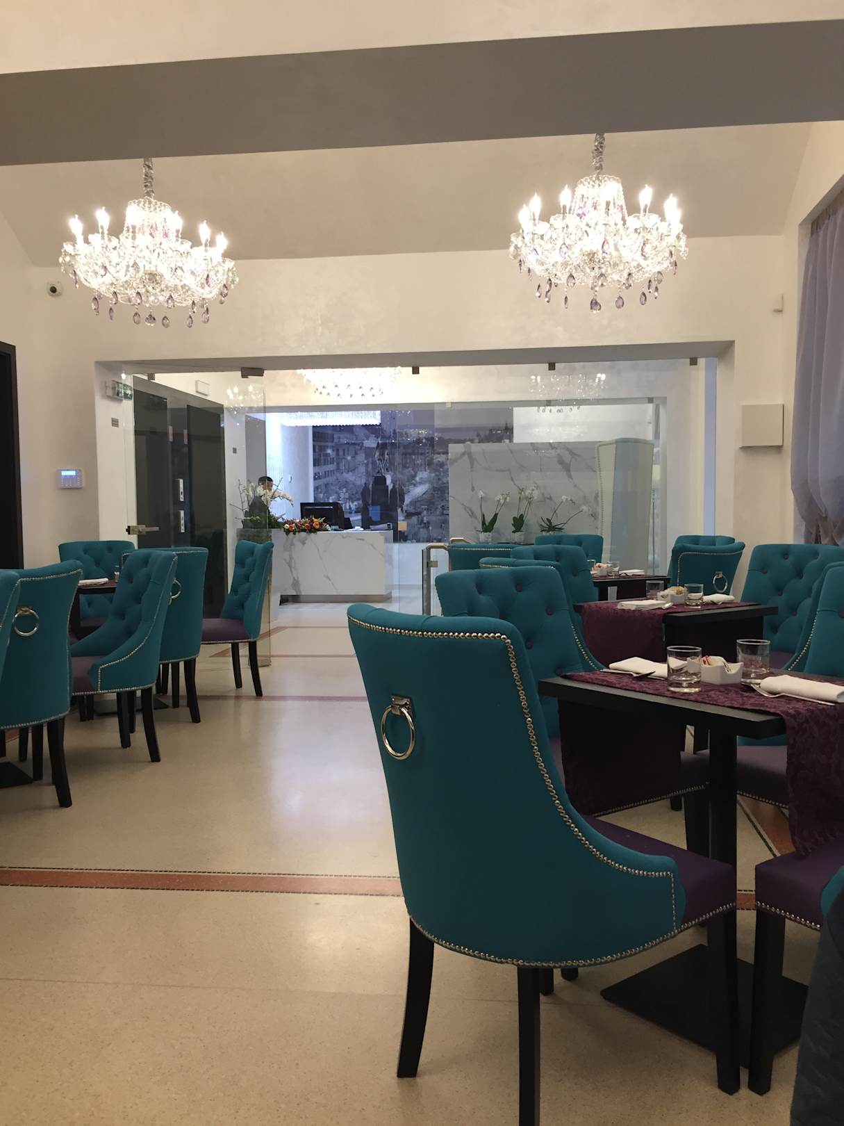 Hinten die Reception, vorne der Frühstücksraum