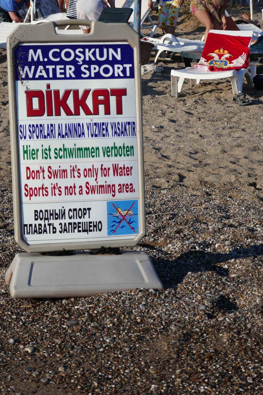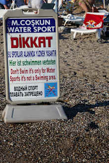 Schild mit Schwimmen verboten am Hotelstrand wegen Fun Booten und Jet Ski