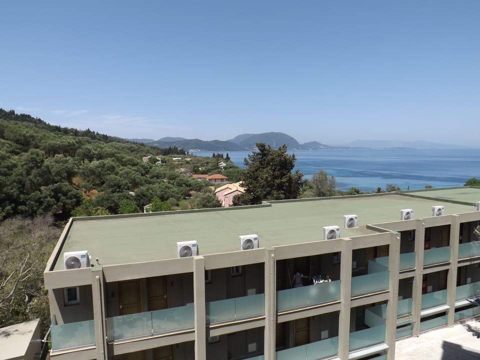 AusblickBlick aus dem Hauptgebäude über eines der vier Nebengebäude Richtung Korfu-Stadt.