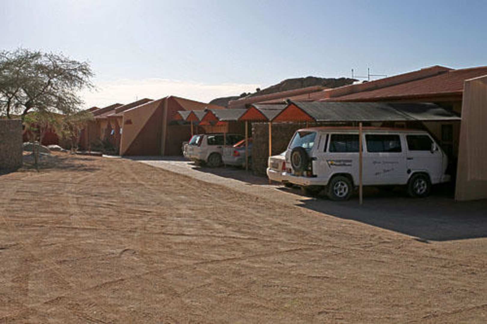 Eingang zur Namib Naukluft LodgeDie Lodge ist etwa 2 km von der C19 entfernt. Es gibt einige gedeckte Parkplätze die aber meistens gut belegt sind.