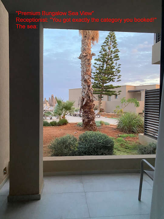 Wir hatten "Premium Bungalow Sea View" (per Tui-Code: "Bungalow Meerblick Typ1") gebucht. Hier seht ihr den Meerblick. Fand ich genauso mies, hab mich beschwert, Rezeptionistin meinte: "Sie haben genau die Kategorie, die Sie gebucht haben!"...