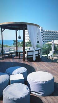Chillout Area des Restaurantbereiches mit Blick auf das atemberaubende Meer.