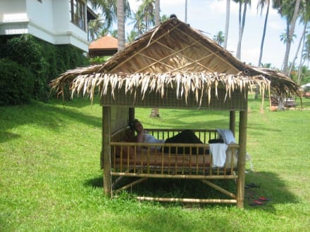 BambushütteZwei von diesen kleinen Hütten stehen etwas abseits von den übrigen Liegen. Wie man am Schatten sehen kann, steht die Sonne hier auf Koh Samui mittags senkrecht, so daß die Schirme (vor allem bei Sonnenbränden) zu wenig Schatten spenden... - ideal für verliebte Paare