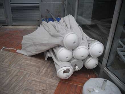 Ecke des Kinderpools mit defekten Sonnenschirmen