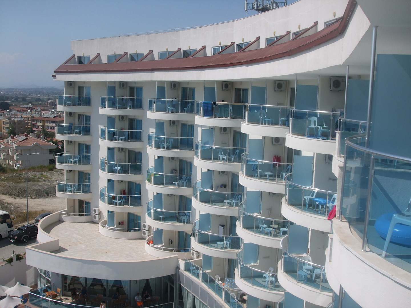 Blick vom Balkon auf das Hotel