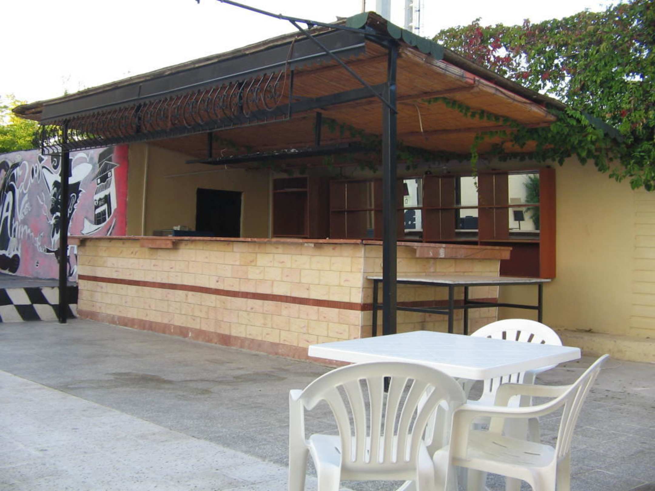 Die Bar, in der nie etwas stattfand, aber stattfinden sollte, leergeräumt, dahinter Müll sowie Säcke mit Brotresten