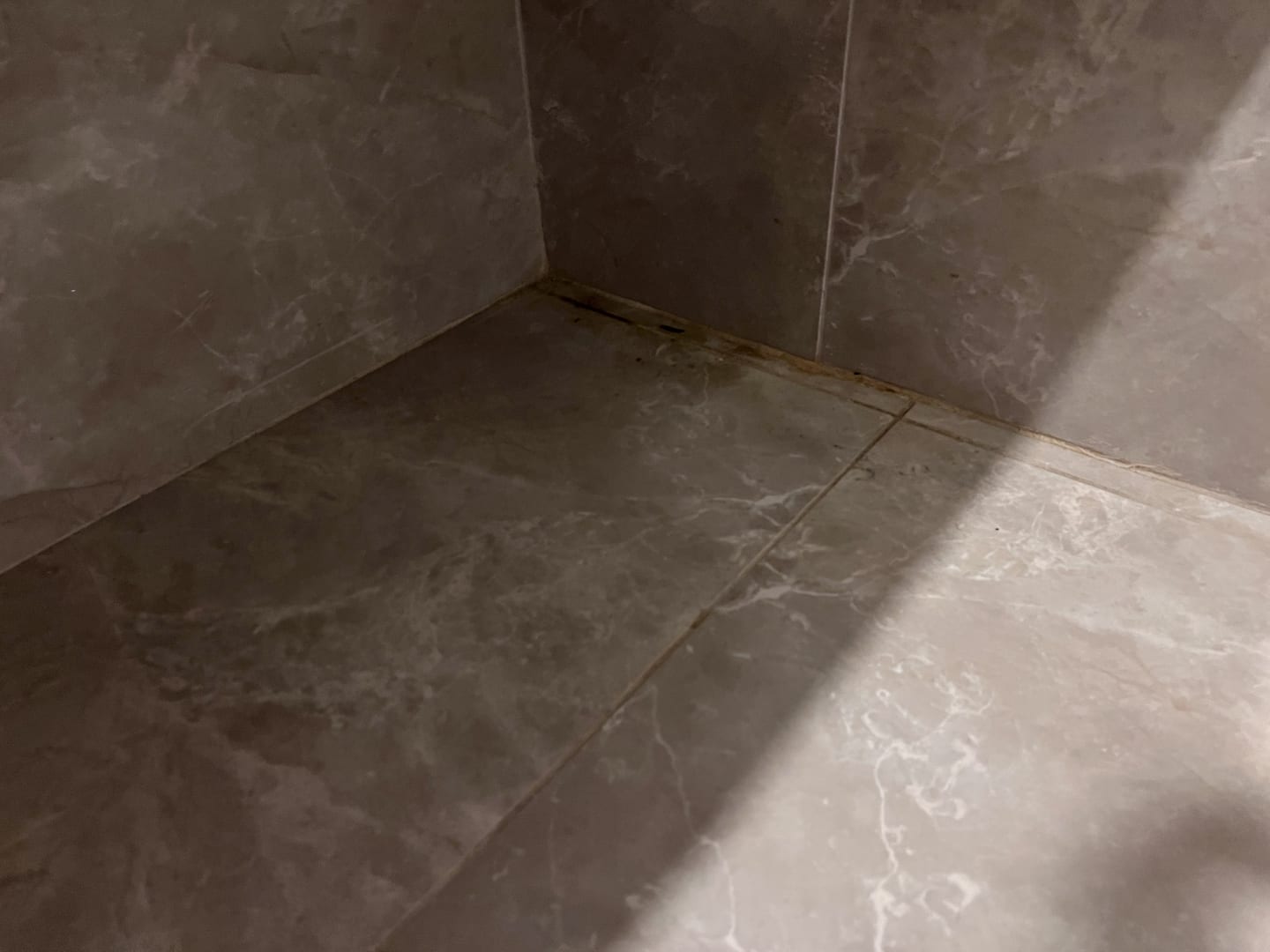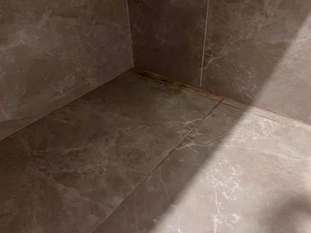Dreck und Schimmel in 2 Jahre alter Dusche. Duschkopf kaputt, Abfluss defekt