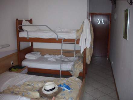 Familienzimmer im Hotel Narcisdies ist unser gebuchtes "Familienzimmer", 2 Einzelbetten zusammengeschoben und ein Hochbett, dessen Fallschutzgitter so sicher war, das unser Sohn durch das Gitter vom Bett fiel.